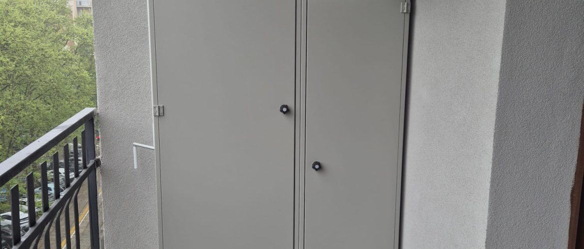 A completamento del progetto, abbiamo installato due armadi affiancati: il primo organizzato con ripiani per detergenti e accessori di pulizia, il secondo volutamente libero per ospitare scope e attrezzature ingombranti. Tutti gli elementi sono realizzati in alluminio verniciato a forno con polveri poliestere RAL 7030 opaco, materiale che assicura una resistenza totale a pioggia, ruggine e sbalzi termici.