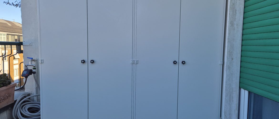 La cliente aveva l’esigenza di organizzare efficacemente il suo terrazzo, trovando una soluzione pratica per riporre scope, scale e diverse scatole. In risposta a questa necessità, abbiamo progettato e installato due armadi in alluminio che, una volta assemblati, si uniscono creando un unico ampio spazio di stoccaggio.