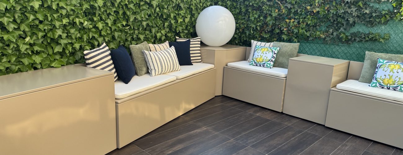 Per rispondere all’esigenza dei clienti di sostituire le vecchie cassapanche in legno deteriorate, abbiamo realizzato un set coordinato in alluminio verniciato a forno: tre cassapanche con schienale e quattro bauli con altezza studiata per allinearsi visivamente allo schienale, garantendo così un’estetica lineare e armoniosa.